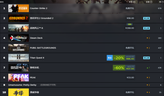 这周周销榜,新游靠“玩法翻新 + 情怀续作”疯狂冲榜(《禁闭求生2》《战地风云6》《泰坦之旅II》 集体高位),经典游戏/设备凭“长期口碑 + 免费/折扣”守擂(CS2霸榜、Steam Deck稳居前列 )。后续新游能否持续霸榜,经典游戏会不会反杀?蹲个下周周销,接着吃瓜!