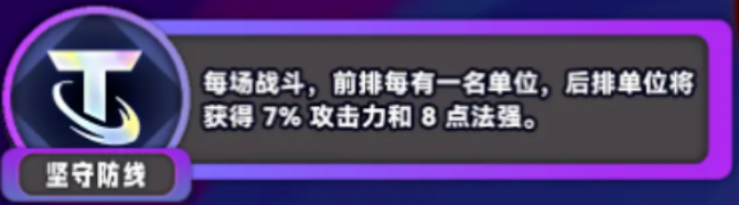 每场战斗,前排每有一名单位,后排单位将获得7%攻击力和8点法强。