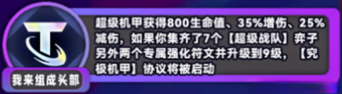 超级机甲获得800生命值、35%增伤、25%减伤,如果你集齐了7个【超级战队】弈子另外两个专属强化符文并升级到9级,【究极机甲】协议将被启动。