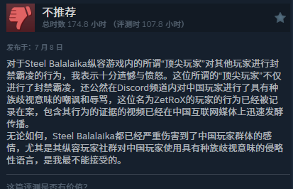 无论如何,Steel Balalaika都已经严重伤害到了中国玩家群体的感情,尤其是其纵容玩家社群对中国玩家使用具有种族歧视意味的侵略性语言,是我最不能接受的。