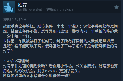 官方汉化不完整,大量军事术语和单位缩写未翻译,导致非军迷玩家理解困难。更严重的是,游戏反作弊机制过于激进,误封使用汉化补丁的玩家,甚至出现“六天封禁”的荒诞情况。这一系列操作不仅打击了玩家积极性,更引发了对官方处理方式的信任危机。