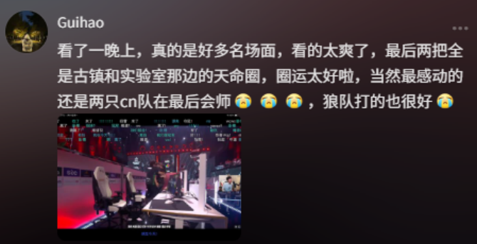 看了一晚上,真的是好多名场面,看的太爽了,最后两把全是古镇和实验室那边的天命圈,圈运太好啦,当然最感动的还是两只cn队在最后会师,狼队打的也很好。