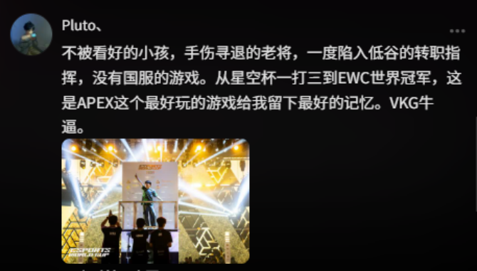 不被看好的小孩,手伤寻退的老将,一度陷入低谷的转职指挥,没有国服的游戏。从星空杯一打三到EWC世界冠军,这是APEX这个最好玩的游戏给我留下最好的记忆。VKG牛逼。