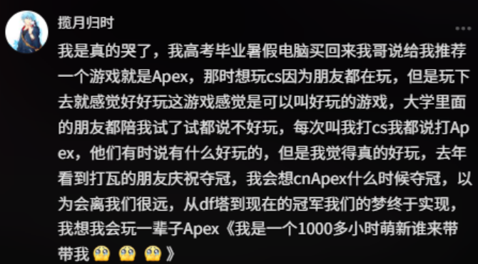 我是真的哭了,我高考毕业暑假电脑买回来我哥说给我推荐一个游戏就是Apex,那时想玩cs因为朋友都在玩,但是玩下去就感觉好好玩这游戏感觉是可以叫好玩的游戏,大学里面的朋友都陪我试了试都说不好玩,每次叫我打cs我都说打Apex,他们有时说有什么好玩的,但是我觉得真的好玩,去年看到打瓦的朋友庆祝夺冠,我会想cnApex什么时候夺冠,以为会离我们很远,从df塔到现在的冠军我们的梦终于实现,我想我会玩一辈子Apex《我是一个1000多小时萌新谁来带带我》