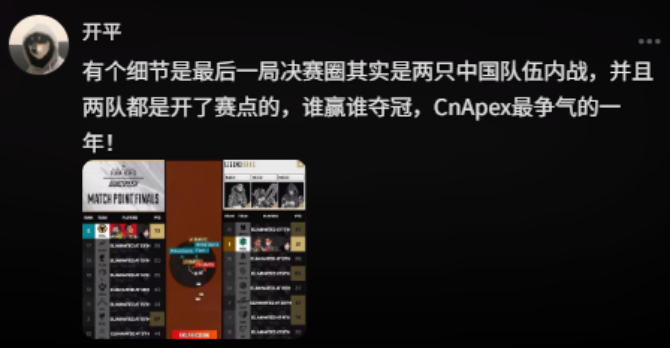 有个细节是最后一局决赛圈其实是两只中国队伍内战,并且两队都是开了赛点的,谁赢谁夺冠,CnApex最争气的一年!