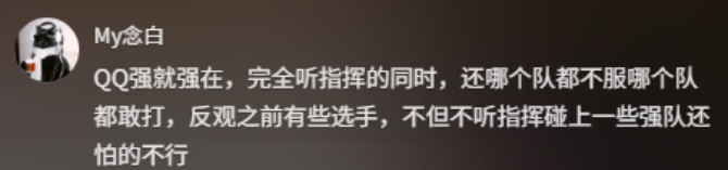 QQ强就强在,完全听指挥的同时,还哪个队都不服哪个队都敢打,反观之前有些选手,不但不听指挥碰上一些强队还怕的不行。