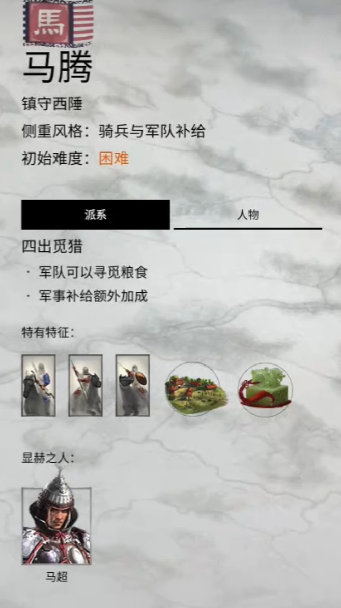 马腾:东汉末年西凉军阀,初始为困难难度。