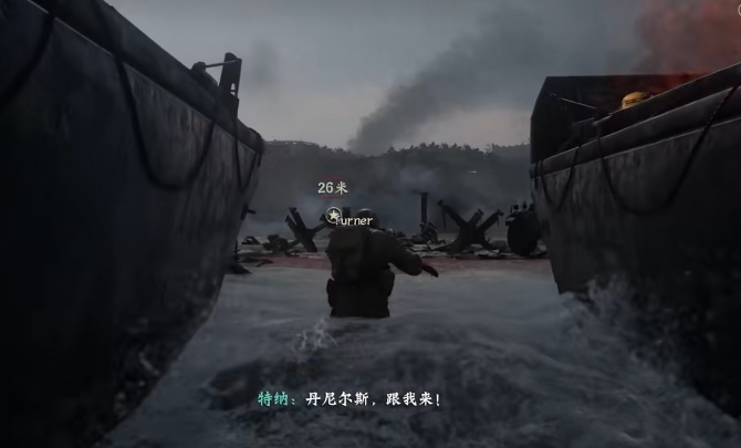 在登陆艇登陆海滩后,从登陆艇两侧翻下,避开正面火力。捡起阵亡爆破手的炸药筒,跟随特纳抵达铁丝网处,按F键引爆。