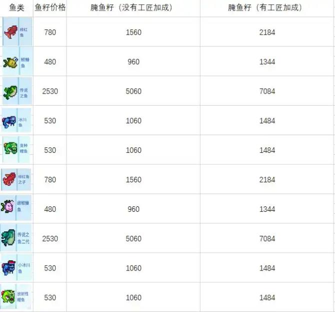 将鱼籽放入罐头瓶进行腌制,会得到腌鱼籽,除了鲟鱼鱼籽腌制后为鱼子酱(前期可以选择这个过度),其他均为腌鱼籽,腌鱼籽的价格为(鱼籽价格X2),如果耕种10级技能选择工匠,腌鱼籽价格会再多40%。比如:绯红鱼的鱼籽价格为780金,无加成腌鱼籽售价1560金,有工匠技能加成腌鱼籽售价2184金。