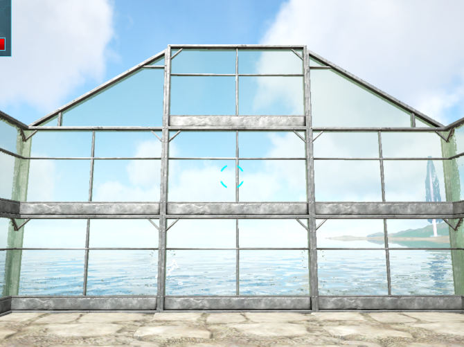接着我们建上温室墙*2高留一面当门,然后建上左右斜温室墙,在它们的空余处按上门框、门、墙,详细如图。