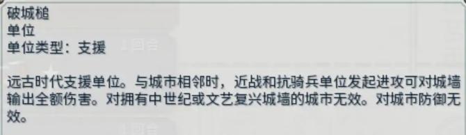 攻城单位:造成轰炸伤害的单位能对城墙造成100%的伤害,如石弩,射石炮,轰炸机,辅助攻城单位如破城槌和攻城塔能帮助近战单位(除骑兵单位)无视远古城墙(破城槌),中世纪城墙(攻城塔)。
