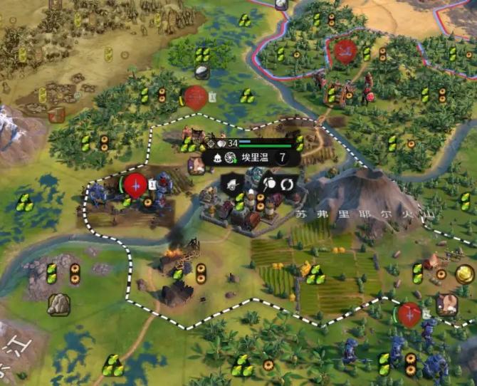 我们来分析一下下方埃里温是如何被围城的,首先最左方的披甲战士有五个完整的控制区域其中有两个控制区域都是控制住了埃里温市中心周围的两格,右边的披甲战士被河流给阻拦了控制区域只有身后的两格,而右边的弓箭手则站在农田上也控制了自身所在的单元格 但弓箭手如果后退到沼泽的话则无法完成围城(因为远程单位只能控制自身所在一格),而在最下方的披甲战士控制住了埃里温最后两个市中心周围的格子达成了围城。