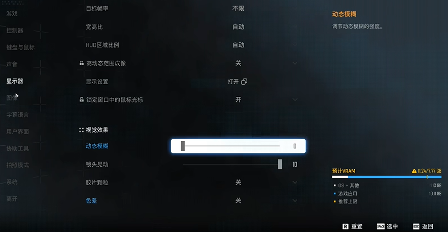 关闭冗余特效:禁用动态模糊、景深,减少VRAM占用并提升帧率。