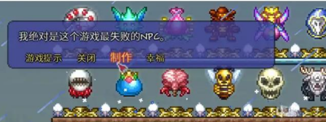 刚刚讲了向导的两个最大用处,一个是当祭品召唤BOSS肉山,这个萌新可以先不做了解;另一个则是问制作配方,由于游戏内庞大的物品量,很多东西的制作配方连老玩家也很难记清楚(比如我),但只要你与想到对话,点击【制作】,就可以将物品描述中带“材料”的物品放入制作框中,得知这个材料能合成的物品(只需要一个材料就可以问其可以制作的所有配方)