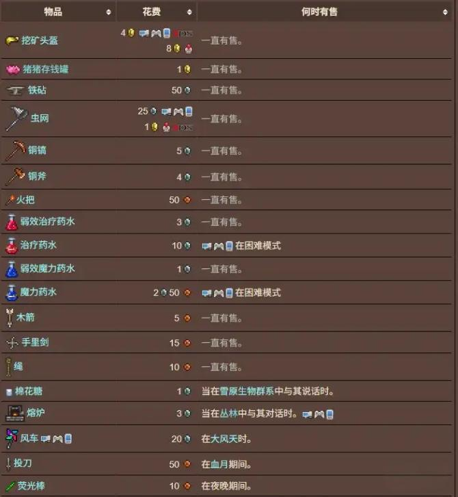 (5)剩下的物品都可以让我们生存更轻松一些,比如火把很便宜,咱们可以多买一些,这样就不用杀史莱姆做火把了,还能避免地下探索时光源不够的情况。铁砧虽然很好做,但也可以省时间买一个。
