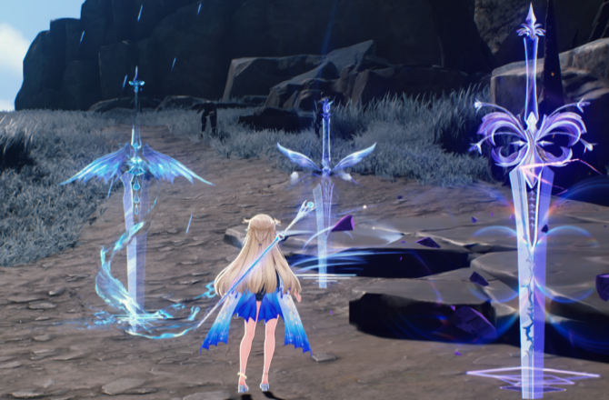 剑打出后,回收就更简单了,只需要我们进行一次空中下落攻击就能执行回收,不管场面上有几把剑,一次下落攻击都能全部回收,这点在共鸣回路上其实有标注出来。