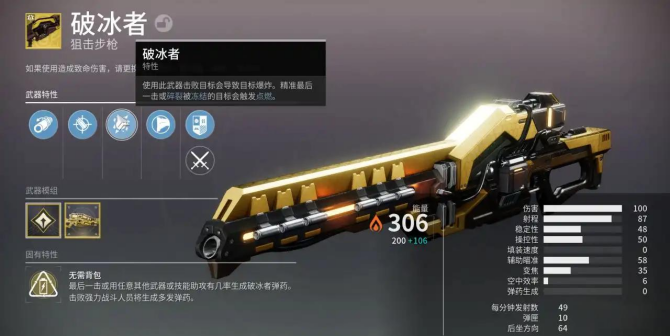 《命运2》这款FPS游戏中,小编受到碎冰术士配装的启发,自己在猎人上也用上异域金狙-破冰者,发现效果意外的好,击碎冻结敌人(或冰影水晶)/精准击杀敌人带来的点燃爆炸,也是补足了光能条涨的较慢的缺点,并且弹药经济非常良好,其他武器击杀或者技能击杀都有概率回子弹,高级敌人回的更多,完全不需要绿弹模组。