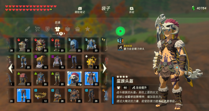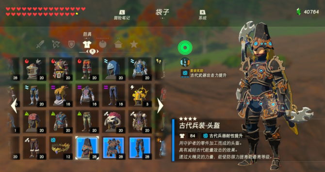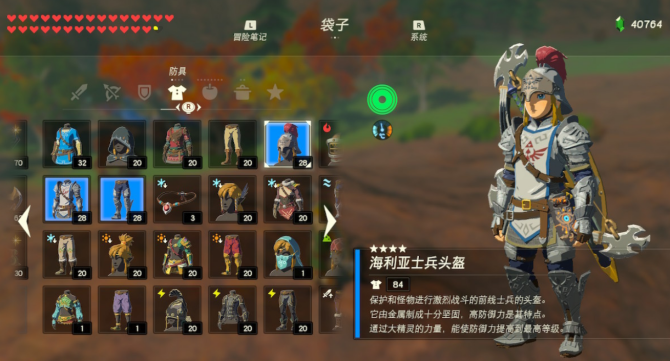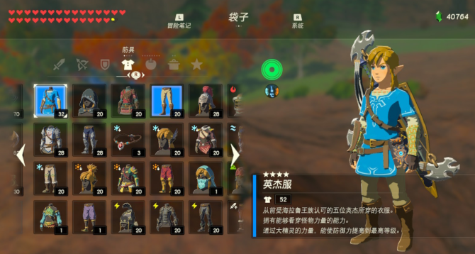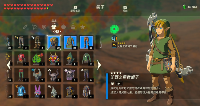 彩蛋套装……旷野之勇者套装。这一套是玩家战胜所有120座神庙后获取的奖励,听到获取途径,想必大家都能明白这是一套特殊的奖励套装,自然意义非凡。虽然没有厉害的套装效果,但拥有历代塞尔达传说传统的“绿帽子”,同时拥有最高之一的防御力,通关之后游山玩水拍照旅行的绝佳选择。