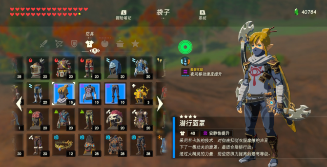如果要排个第二的话,我一定会选择潜行套。这套衣服的效果是提高安静性,旷野之息中有许许多多的生物,有了这套衣装,抓虫、抓鱼、打猎再也不是困难。巧用套装,还可以避免大多数的战斗场景,当之无愧是我第二喜欢的套装,第一次游玩游戏时,我穿戴这套衣服的时间也非常的长。