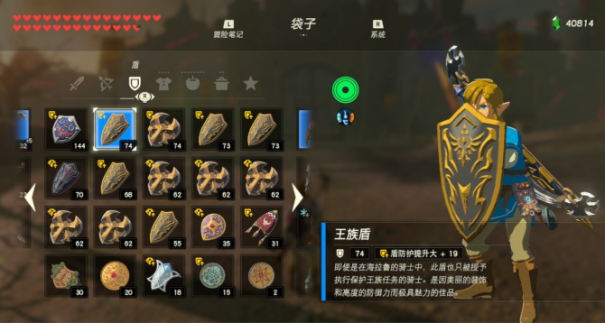 不论是获取兽神盾之前或是之后,海拉鲁中数量巨多的王族盾仍然可以作为第一选择。外观中规中矩,防御力可观,更重要的是,耐久性也非常不错,最关键的一点无疑是数量众多,随处可见。