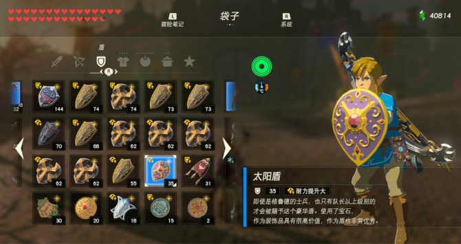 最后要介绍的,是一把因盾滑而出名的盾牌——太阳盾。这把盾牌防御力并不出众,但优秀的是非常适合盾滑。相信各位海拉鲁老流氓都知道,在草地上、沙漠中、雪地上随时随地来一把盾滑是多么的快乐。因此,适合盾滑而上榜的太阳盾可并不亚于其余性能优秀的盾牌。
