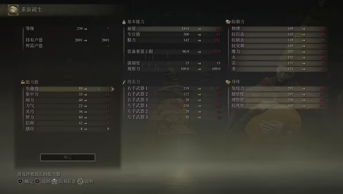 面板属性:八项属性其实很好懂:生命力=血量,集中力=蓝条,耐力=精力+负重,这三项不管玩啥流派都得加,具体加多少看你需求;剩下力气、灵巧、智力、信仰、感应,这五项直接影响攻击力,流派差异全在这——比如跳劈流要加力气+灵巧,祷告流得堆信仰,一眼就能分清。加点时盯着高亮提示,比如加耐力,精力、负重上限、防御力都会涨,超直观。