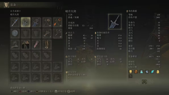 武器方面:选好武器先看“必需能力值”,需求高的就是主属性;再看“能力加成”,S级最高、E级最低,加成最高的属性往死里加,一周目60点、二周目80点准没错。而且武器强化越高,加成也会涨,比如暗月大剑+0时智力加成是C,+10就变成B了。