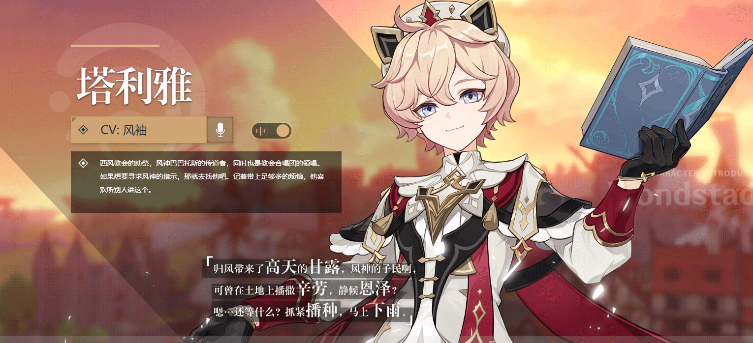 塔利雅(水元素·单手剑):西风教会助祭,定位为辅助角色。她能提供护盾保护与全队攻击速度加成,水元素反应能力使其在多元素队伍中具备出色的兼容性。