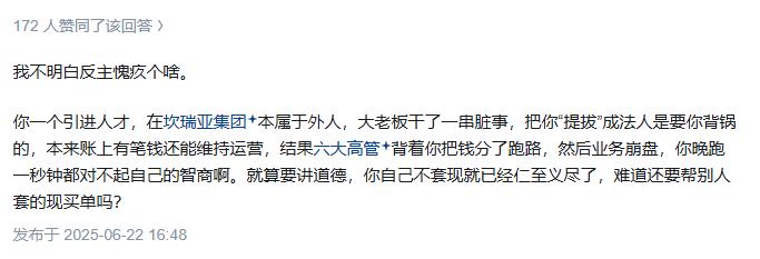 我不明白反主愧疚个啥。 你一个引进人才,在坎瑞亚集团本属于外人,大老板干了一串脏事,把你“提拔”成法人是要你背锅的,本来账上有笔钱还能维持运营,结果六大高管背着你把钱分了跑路,然后业务崩盘,你晚跑一秒钟都对不起自己的智商啊。就算要讲道德,你自己不套现就已经仁至义尽了,难道还要帮别人套的现买单吗?