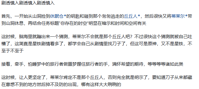 剧透慎入剧透慎入剧透慎入 首先,一开始从山洞捡到休眠仓的钥匙和碰到那个匆匆逃走的丘丘人,然后很快又将蒂莱尔带到山洞休息,再结合任务标题“你存在的时空”明显在暗示和时间和空间有关 这时候,脑海里就蹦出来一个猜测,蒂莱尔不会就是那个丘丘人吧?不过很快这个猜测就被自己吐槽了,这简直是星铁剧情看多了,都学会自己从剧情里找刀子了,但这可是原神,又不是星铁,不至于不至于 接着,牵手,怕睡梦中的旅行者做噩梦握住旅行者的手,满怀希望的期待,等等等等诸如此类。