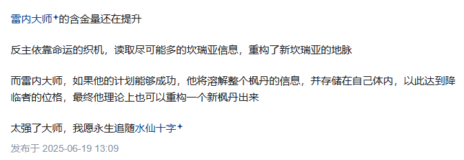 雷内大师的含金量还在提升 反主依靠命运的织机,读取尽可能多的坎瑞亚信息,重构了新坎瑞亚的地脉 而雷内大师,如果他的计划能够成功,他将溶解整个枫丹的信息,并存储在自己体内,以此达到降临者的位格,最终他理论上也可以重构一个新枫丹出来 太强了大师,我愿永生追随水仙十字。