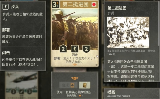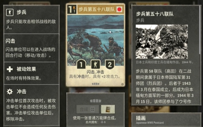 步兵第五十八联队,拥有“冲击”特性,一费实际上拥有三点伤害,适和在前期去解决对手的大耗费单位,同时拥有闪击,可以占领前线给对方施加压力。
