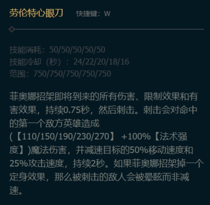 W技能,防御,可以招架所有伤害,招架完会刺击前方,被刺击命中的敌人会减移速和攻速,如果招架了控制技能,那刺击会带眩晕效果。