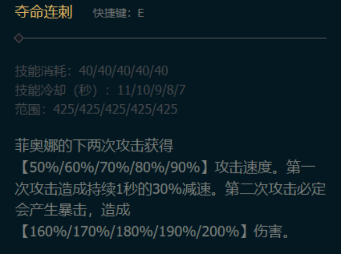 E技能提升接下来两次普攻攻速,第一次攻击带减速,第二次百分百会暴击。