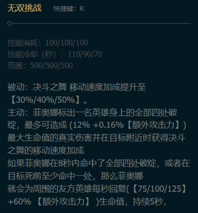 大招,标记敌方身上的四个破绽,攻击破绽移速加成,造成百分百真实伤害,打破全部破绽或者击杀目标,会产生一个回血阵。
