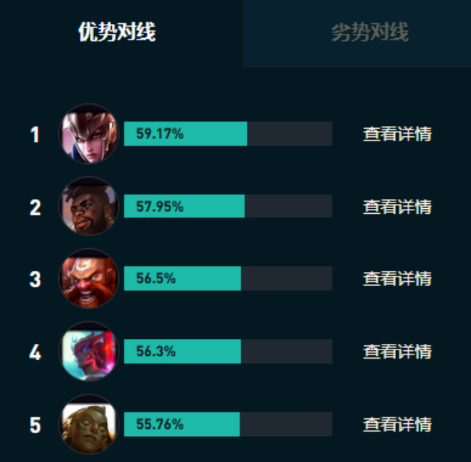对位奎因、奎桑提、酒桶、永恩、俄洛伊时,胜率较高。