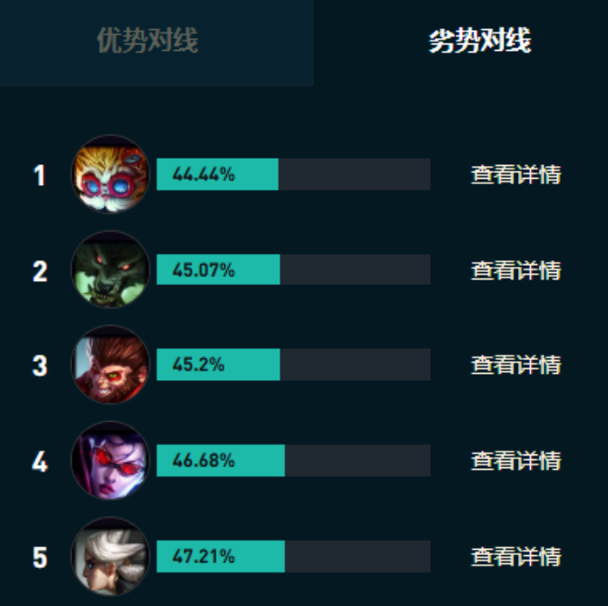 对位大头、狼人、猴子、薇恩、卡米尔时胜率比较低。