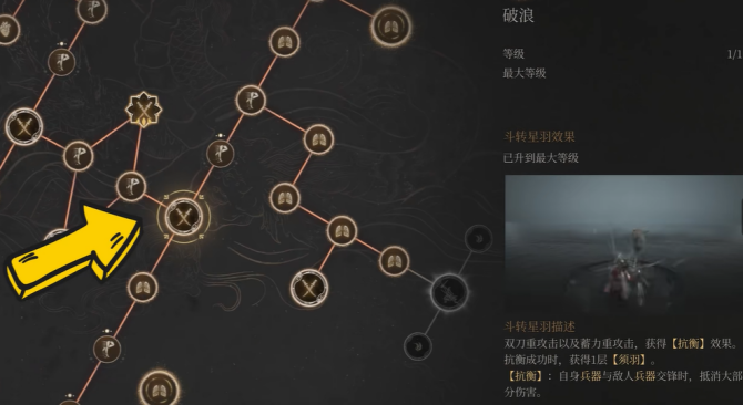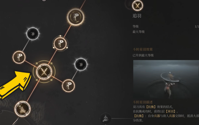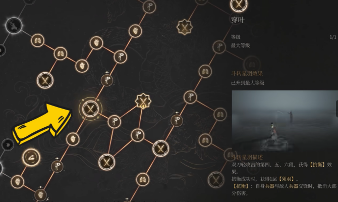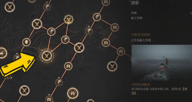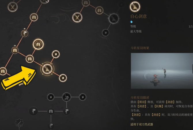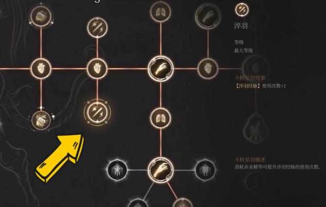 首先复活点选择斗转星移,打开技能树,左边技能树分支为通用技能,其余分支为武器技能。在左侧找到“羽骨砭吸血”,这就是吸血技能。
