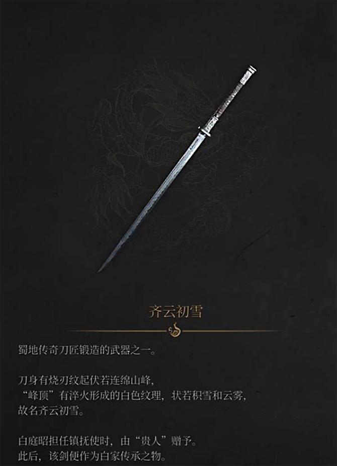 齐云初雪,长刀,是主角新手武器,也是背景故事里,父亲亲手交给主角的,后续boss剧情中,会因这刀改变故事走向。