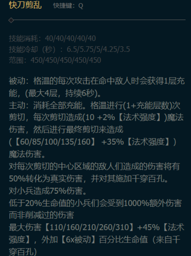 格温是上单英雄,技能伤害为魔法伤害,是后期能接管比赛的大爹,接下来详细说说格温是打法思路。