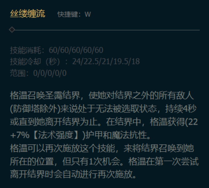 W技能,防御神技,召唤结界,结界之外的敌人无法选择格温,期间获得护甲魔抗,可以再次释放改变结界位置。