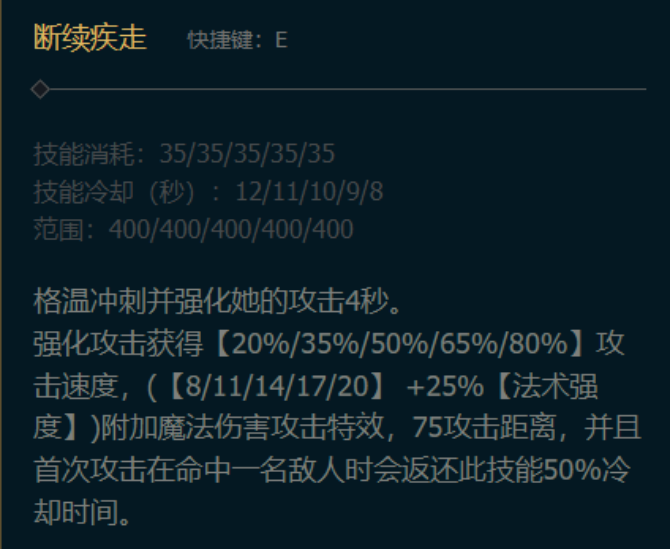 E技能,位移,冲刺增加攻速,首次命中敌人减一半CD。