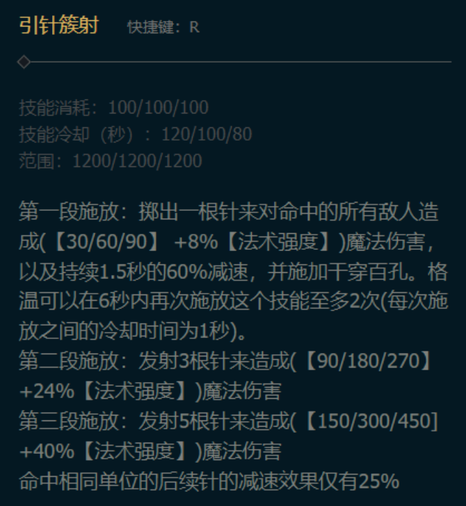 R技能,大招,一共三段,扔出几根针对敌方造成魔法伤害并减速。