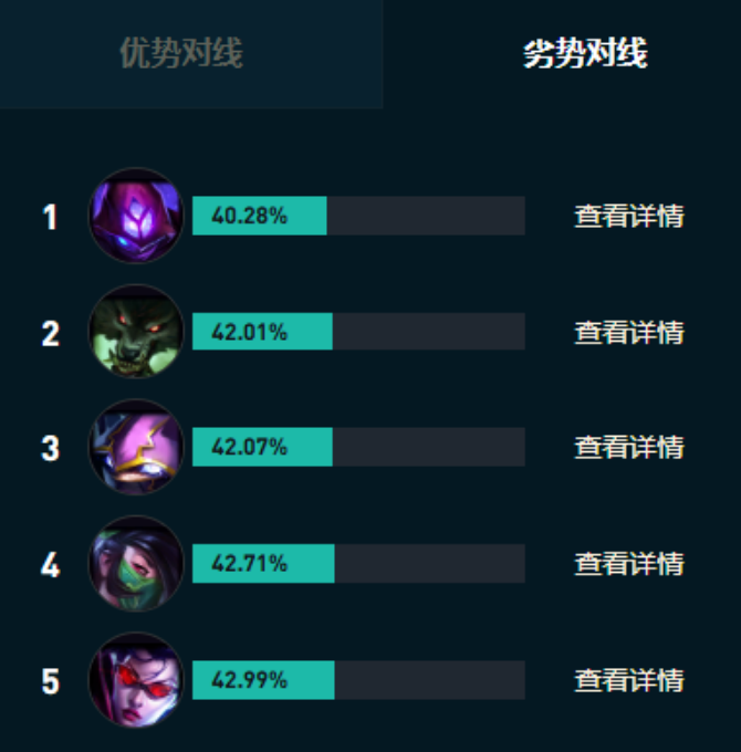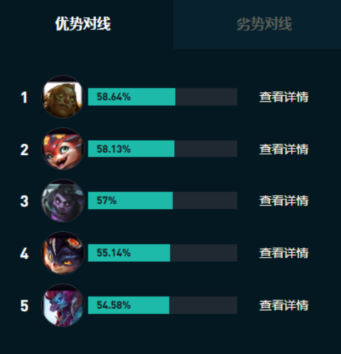 对位俄洛伊、小火龙、蒙多、兰博、巨魔时,胜率较高。