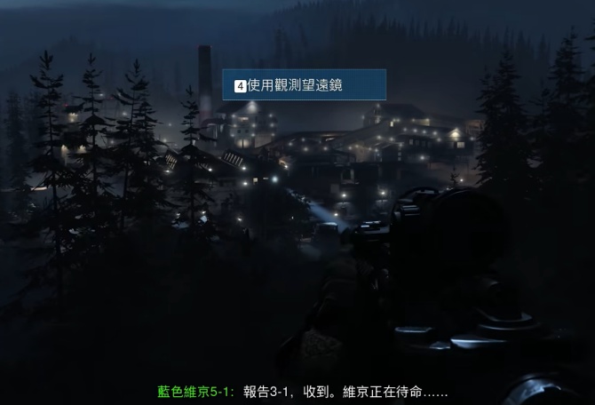 抵达树林边缘后,按数字键4切换望远镜,用望远镜观察大门入口,标记卡车运输路径。