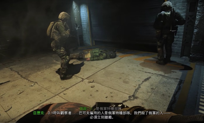 清缴完成后打开电源,我们会发现交战的是俄军特种部队,随后爬上卡车检测毒气。