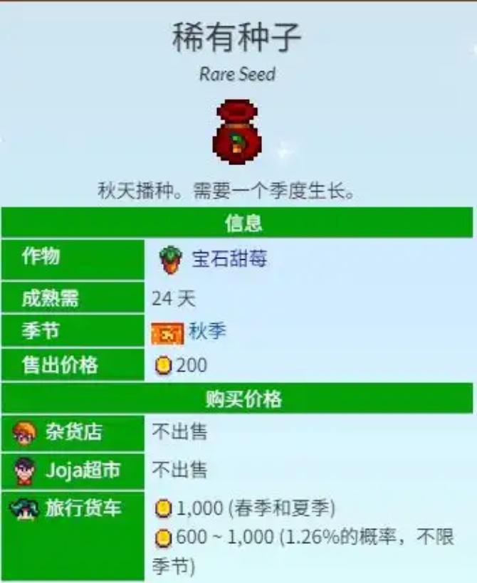 草莓:草莓种子在复活节花费100购买或者沙漠开启后去卡利科三花蛋商人处购买,可以用种子生产机批量生产。