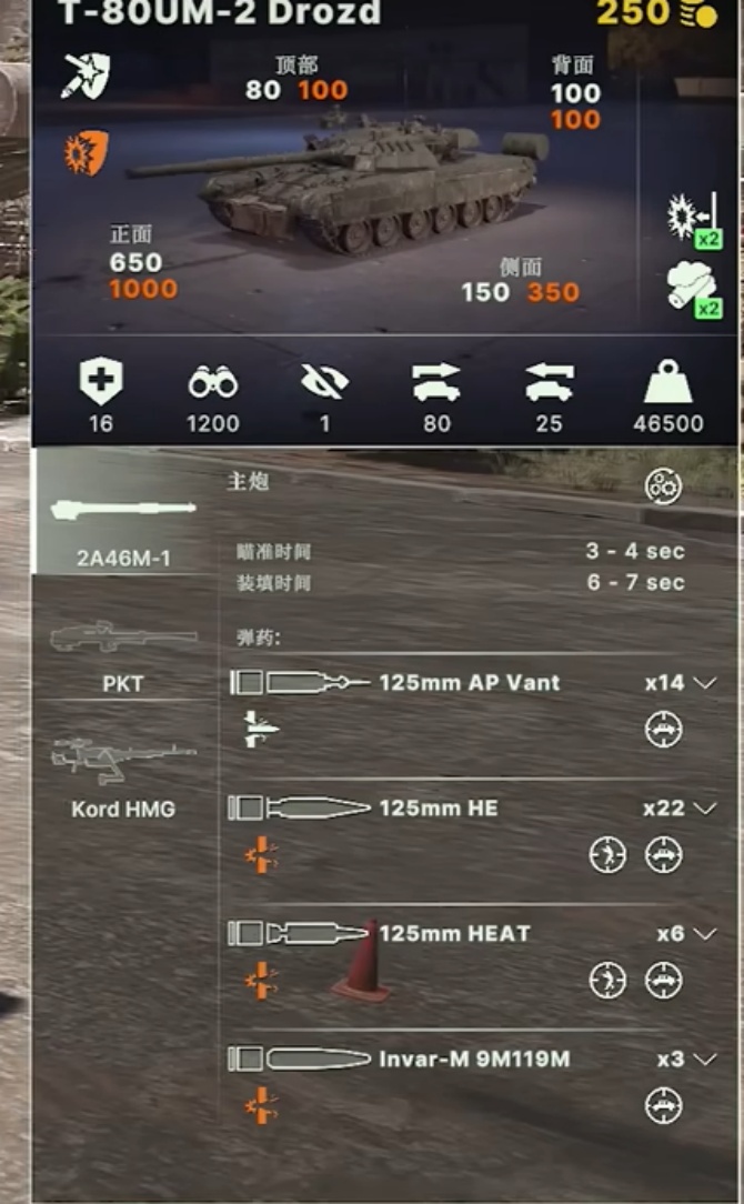 使用125mm口径的反坦克炮,拥有高性能的APFSDS弹药,足够用来杀伤游戏中绝大多数装甲单位了