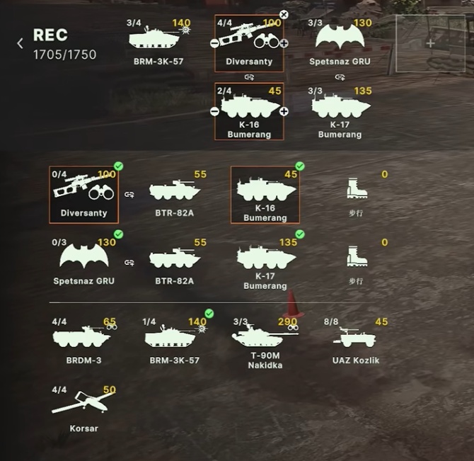 侦察型BMP-3、K16轮式战车、狙击手与GRU特种班的组合,是一套兼具火力、机动性与侦察能力的战术体系。3台升级57mm炮塔的BMP-3可以高效压制轻装甲与步兵,并且执行侦察任务;四队狙击手(微声步枪+RPG30)擅长远程定点清除,关闭主动开火后又可以隐藏身形,持续为玩家提供视野,配合GRU(RPG28)蝙蝠侠班组的渗透破坏,既可以应对改装了主动防御系统的美军战车,也可以有效应对重装载具。而K16轮式战车提供了灵活的游击支援,能够快速填补战线缺口,100的速度能高速搭载步兵运抵前线。而在具体的战术上,需利用BMP-3与狙击手快速侦察标记目标,使用装甲或者火炮实施“发现既摧毁”的循环,bmp和k17步兵战车能针对敌方薄弱侧翼或后方切入。