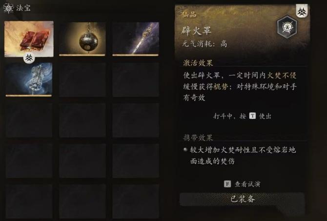 法宝:就是在游戏中探索中寻得的法宝,不同法宝效果不同。在特定战斗中可以使用法宝,它的作用很大。但要在元气饱满时使用法宝,因为法宝生效期间消耗元气。在元气耗尽后需要攻击敌人重新吸收元气 。
